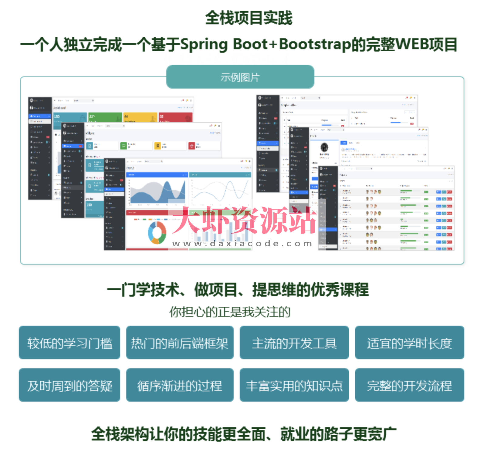 本课程涵盖Spring Boot和Bootstrap较为多面的知识点,针对Spring Boot开发web项目中每个阶段的关键内容和痛点,一步步进行条理清晰的讲解,学员在听课过程中建立起自己较为完备的前端、后端知识体系,具备较好的项目开展能力和自信。